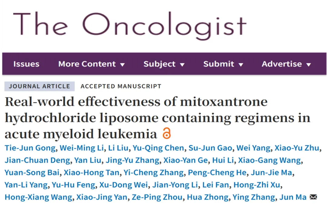 近期, 一項由哈爾濱血液病腫瘤研究所馬軍教授牽頭開展的,鹽酸米托蒽醌脂質(zhì)體注射液治療急性髓系白血?。ˋML)的全國多中心、真實世界研究結(jié)果于《The Oncologist》雜志正式發(fā)表,該數(shù)據(jù)首次披露了真實世界中米托蒽醌脂質(zhì)體在AML患者的療效以及安全性,為其在白血病的應(yīng)用提供更多循證證據(jù)。