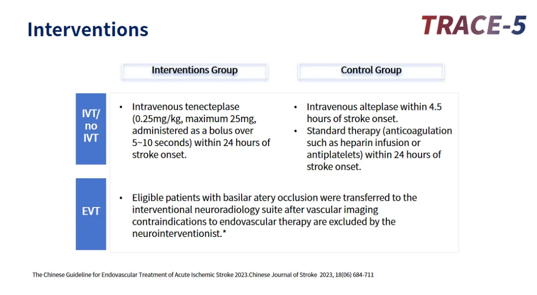 TRACE-5研究是由首都醫(yī)科大學(xué)附屬北京天壇醫(yī)院王擁軍教授團(tuán)隊(duì)發(fā)起的一項(xiàng)多中心、前瞻性、開放標(biāo)簽、終點(diǎn)盲法、隨機(jī)對照臨床試驗(yàn)。該研究旨在探究在發(fā)?。ɑ蚺R床表現(xiàn)惡化/昏迷)或距最后正常時(shí)間24小時(shí)內(nèi)基底動脈閉塞的卒中患者中使用替奈普酶靜脈溶栓的有效性和安全性。主要納入癥狀發(fā)生后24小時(shí)內(nèi)、磁共振血管成像(MRA)/ CT血管成像(CTA)提示基底動脈閉塞或次全閉塞,24小時(shí)內(nèi)是否接受取栓可由當(dāng)?shù)蒯t(yī)生決定。研究主要結(jié)局為3個(gè)月時(shí)mRS評分為0-1分(無殘疾)或恢復(fù)至基線mRS(如果發(fā)病前的基線mRS為2-3分)的患者比例,安全性結(jié)局包括癥狀性顱內(nèi)出血(sICH)患者的比例90天內(nèi)的全因死亡率。