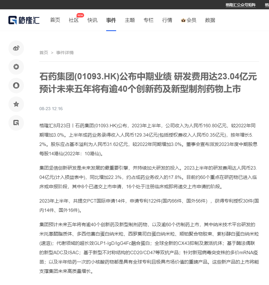 石藥集團(tuán)(01093.HK)公布中期業(yè)績(jī) 研發(fā)費(fèi)用達(dá)23.04億元 預(yù)計(jì)未來(lái)五年將有逾40個(gè)創(chuàng)新藥及新型制劑藥物上市